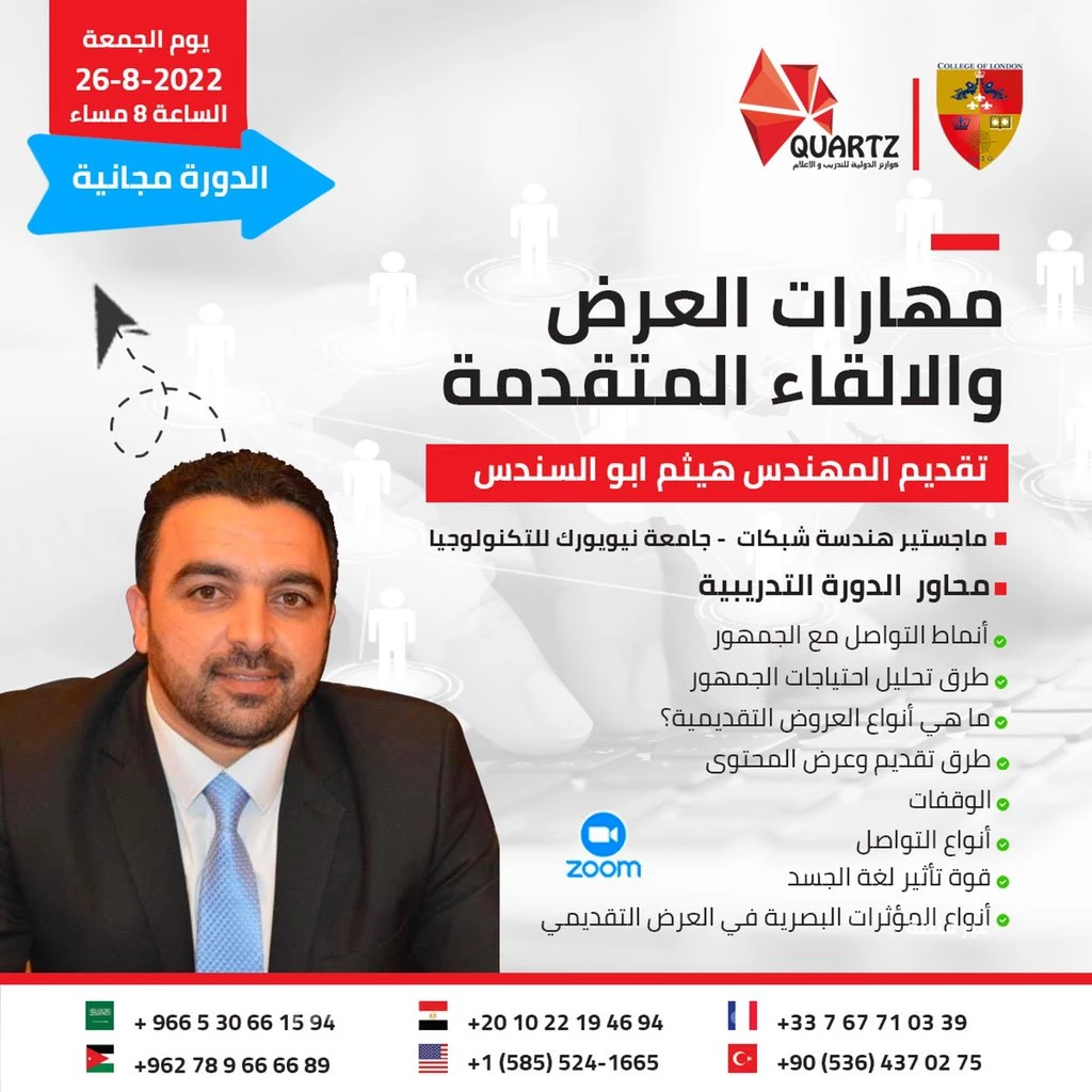 · اتقان التعامل مع الكاميرا وأساليب بناء الحضور للمتحدث والمقابلات وأساليبها المختلفة