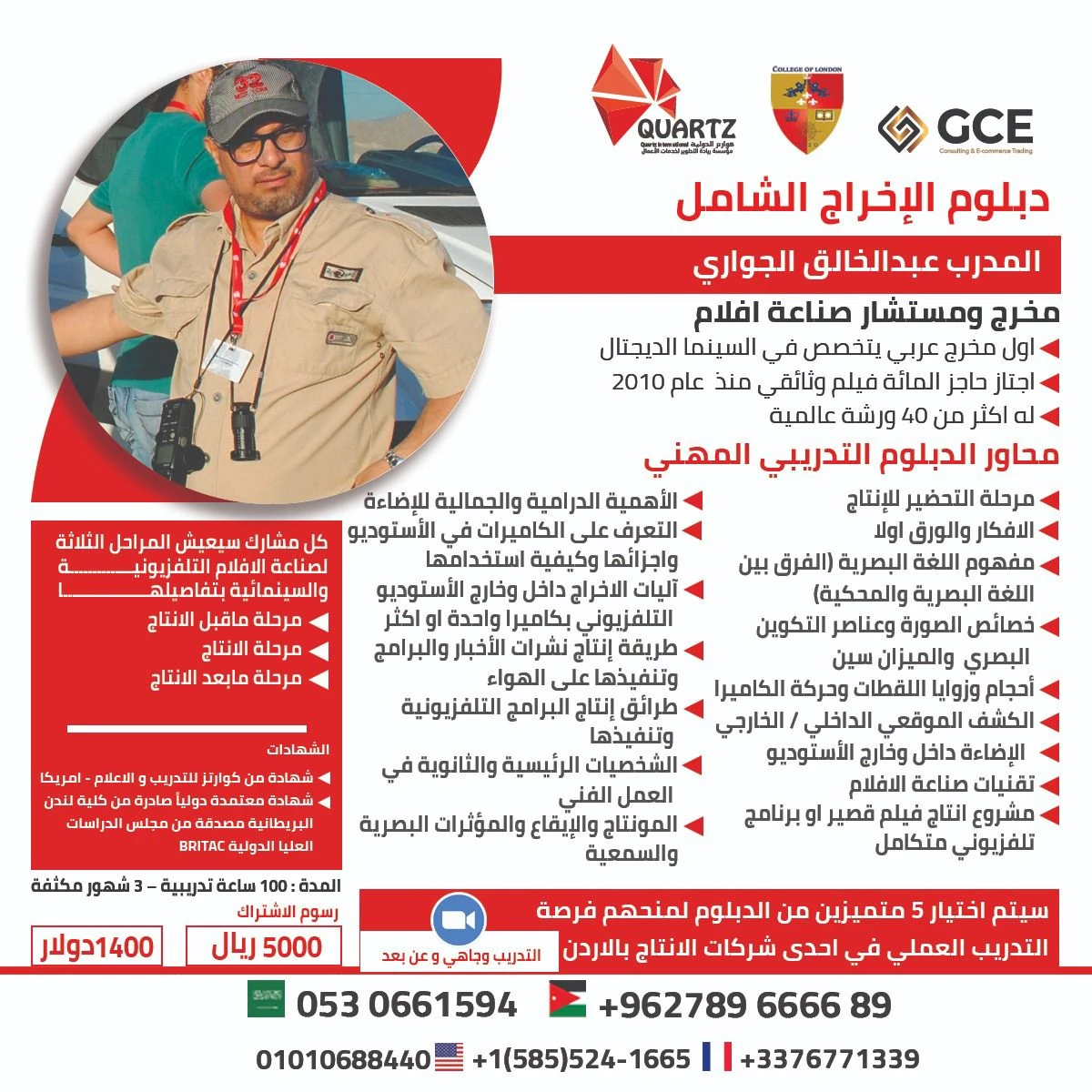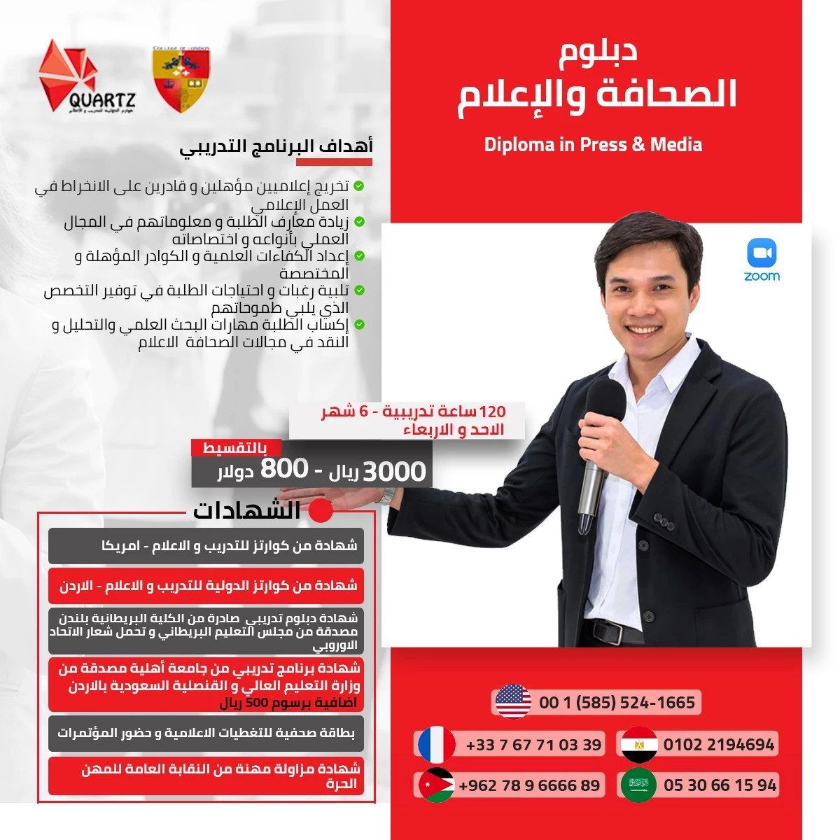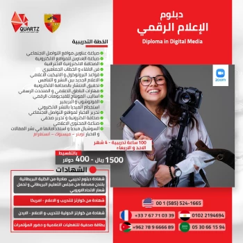 استجابة للتوسع الكبير والتطور المتسارع الذي يحدث في مجال الإعلام الرقمي والإلكتروني ليس فقط المؤسسات الإعلامية بل كافة المؤسسات التي تعكف على استثمار هذا النوع من الإعلام في تحقيق متطلباتها والتعريف بإنجازاتها والاتصال والتواصل قمنا بكوارتز الدولية للتدريب و الاعلام بطرح دبلوم الاعلام الرقمي وفقاً لأحدث التكنولوجيا الإعلامية التي تجذب انتباه وتثير اهتمام جمهورها، كما أن الإعلام الرقمي أصبح الحاضن الرئيسي لكافة وسائل الإعلام المختلفة وحاجتها لطاقم إعلامي متخصص وكادر مدرب في الجوانب العملية والفنية قادر على استخدام وتسخير التكنولوجيا والتقنيات الحديثة في الإعلام الرقمي التفاعلي وفقاً للأساليب الحديثة في مجال التصوير والمونتاج والتصميم الجرافيكي والإخراج الإليكتروني الرقمي .