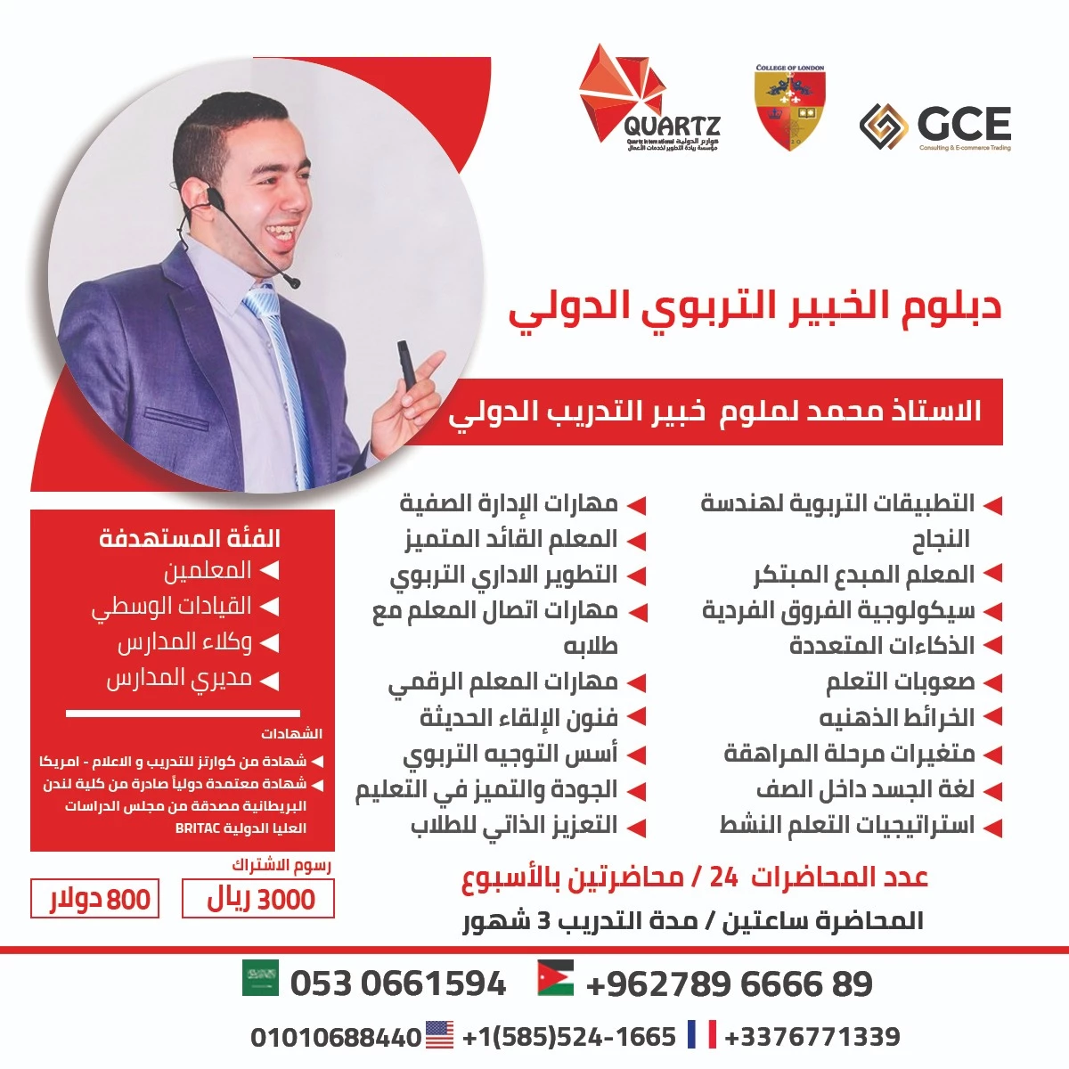 -         شهادة دبلوم تدريبي من كوارتز الدولية للتدريب والاعلام معتمدة دوليا صادرة من -  أمريكا